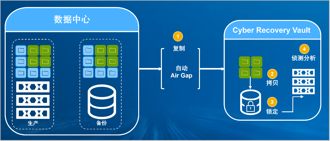 kaiyun开云电竞防勒索病毒方案将生产中心备份数据复制到Vault区,复制后网络自动断开实现弹性隔离。Vault区的数据快速拷贝,并对拷贝版本加锁(在锁定期数据不允许删除和修改)。Vault沙箱内对拷贝版本进行扫描分析,验证数据是否完好。